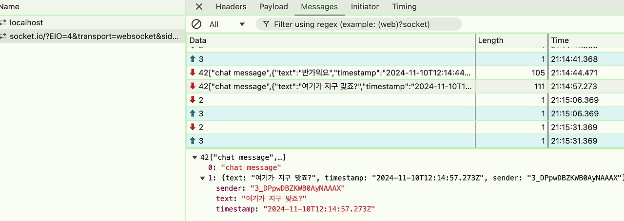 - WebSocket ํ๋ ์(Frame) ํญ์์ ์ฃผ๊ณ ๋ฐ๋ ๋ฉ์์ง๋ฅผ ํ์ธํ์ฌ ๋ฐ์ดํฐ ํ๋ฆ์ ํ์