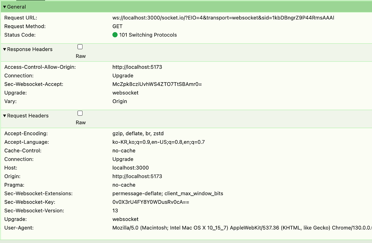 - Sec-WebSocket-Key์ ํจ๊ป WebSocket ์ฐ๊ฒฐ ์์ฒญ์ ๋ณด๋.